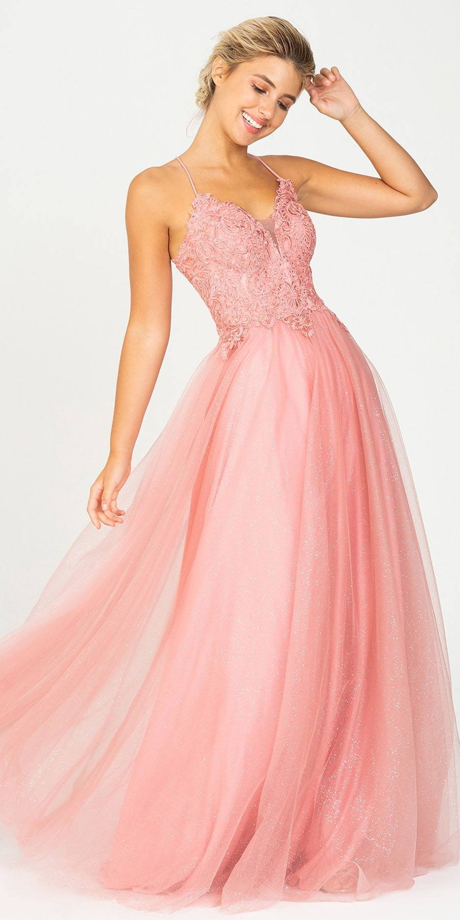 Stand out and shine wearing this glittering ball gown by Eureka Fashion 9901 in dusty rose. This A-line silhouette gown is made of glitter mesh with lace appliques decorating the bodice and feature a V-shape neckline supported by a delicate tie connected to the corset lace-up back. This long formal dress is lined with a comfy fabric, a beautiful dress perfectly made for prom, red carpet events or in any other formal occasions!