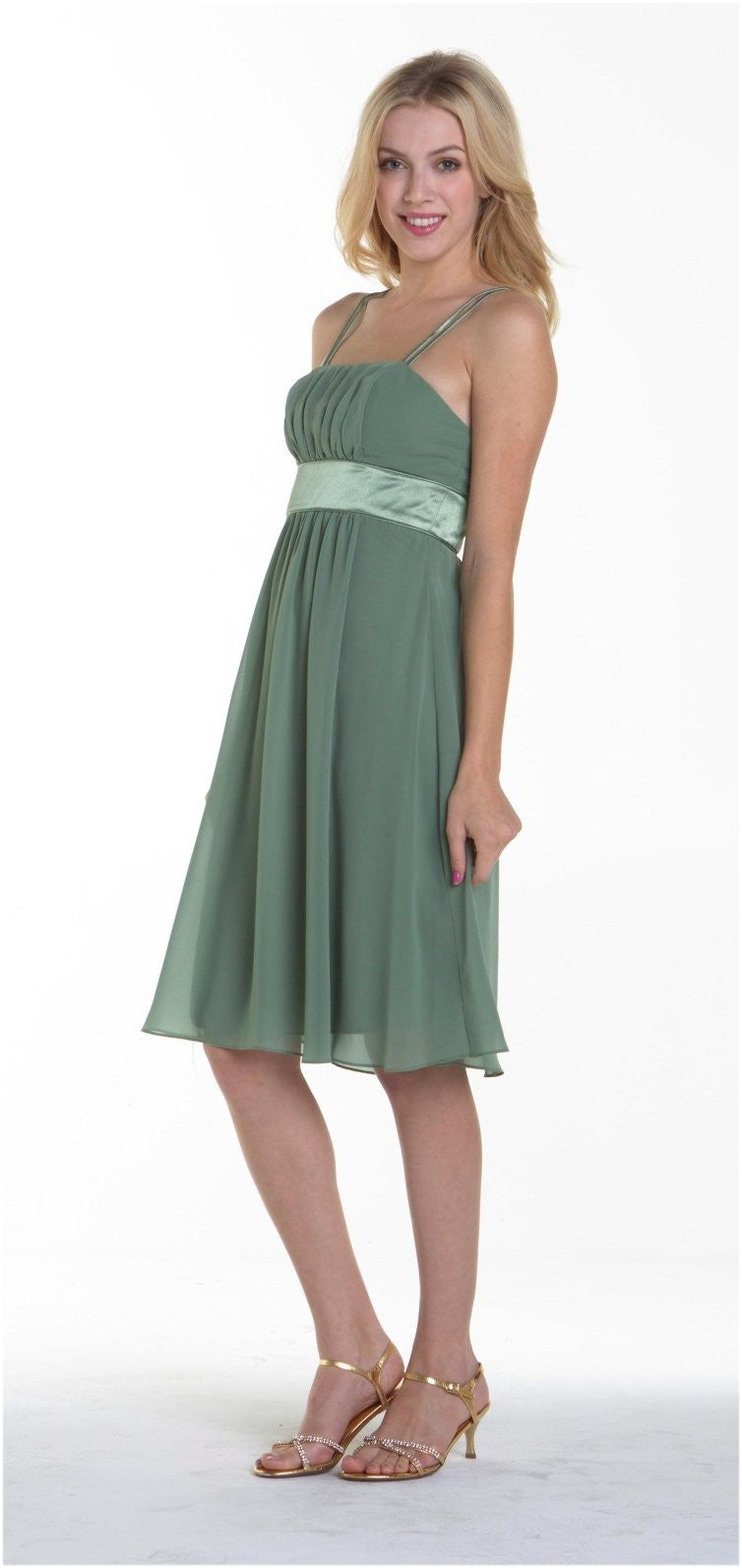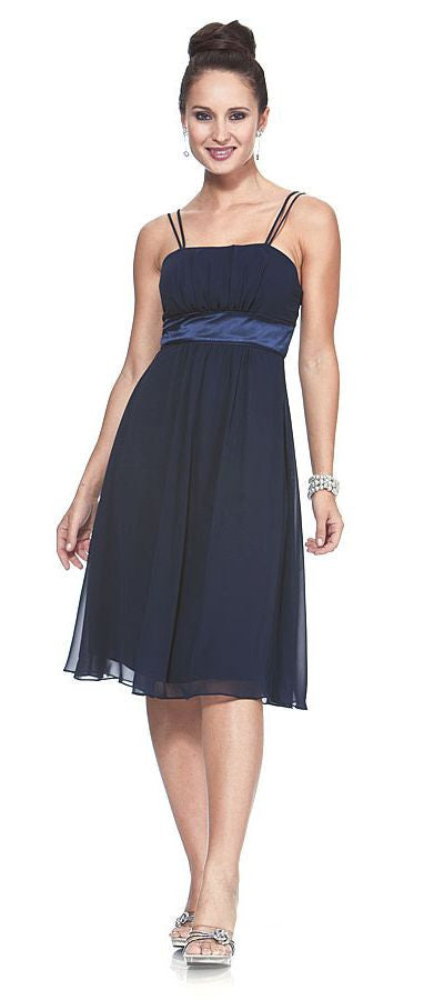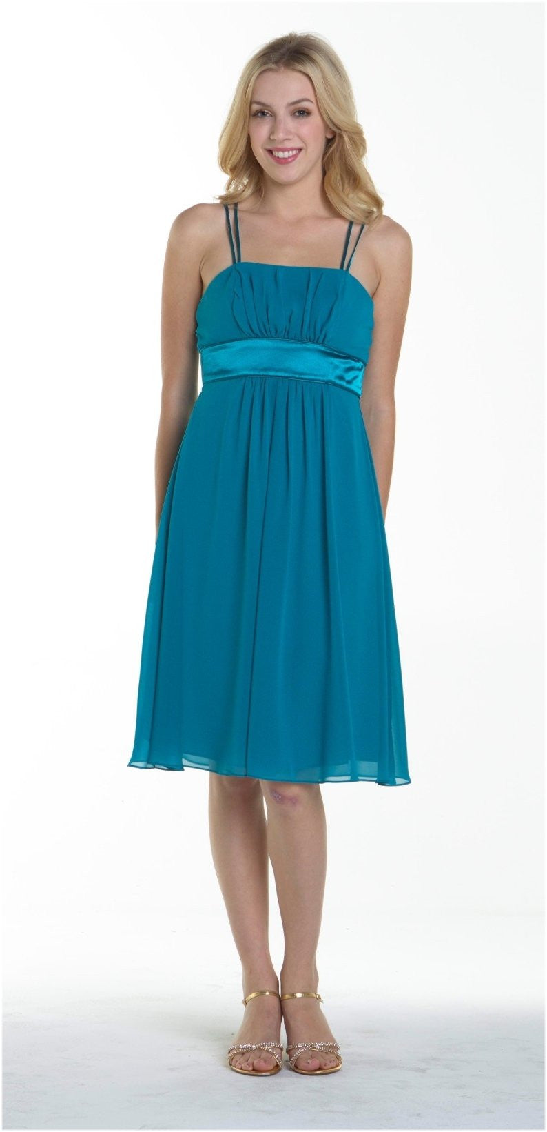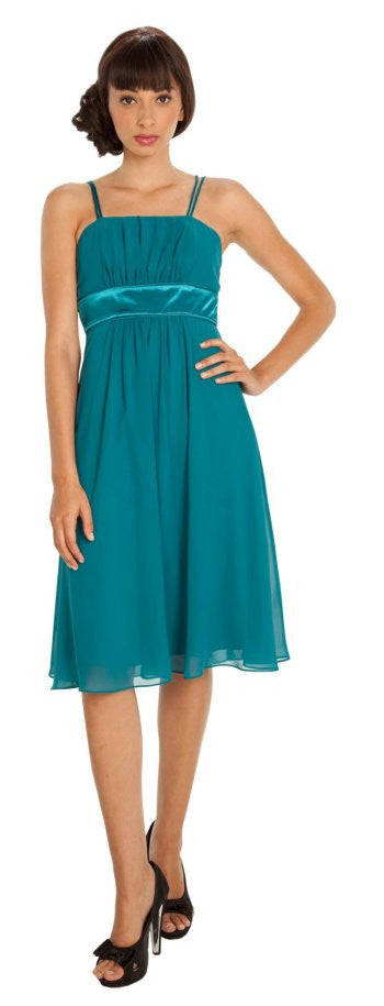 CLEARANCE ITEM - Imagine yourself wearing this short A-line formal dress by Poly USA | Ed Young 2857. This classic knee-length formal dress features spaghetti straps, square neckline and a satin empire waistband. This beautiful knee length dress is absolutely fabulous for bridesmaid, pageant, prom or in any other formal occasions!