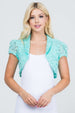 Crochet lace cropped shrug/bolero jacket with open front and cap sleeves.