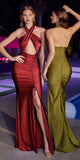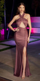Imagine yourself wearing this beautiful floor length evening gown for your next formal event.  This long formal fitted dress by Ladivine BD7026 has a halter neckline with a keyhole bodice for extra showstopper flare. The pin tuck front and back with a front leg slit keeps this dress tight and fitted.