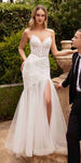 Ready to make an unforgettable entrance? Walk into your special day in this timeless gorgeous mermaid gown by Ladivine CD0215W! The strapless, pointed sweetheart neckline with sheer inset and sheer boned bodice with beading will show off your curves and leave heads turning! The long, sheer layered tulle skirt with leg slit and sweep train will make sure you look equally stunning from the front as you do from behind! A perfect choice for brides who want to look glamorous!