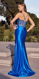 Imagine yourself in this beautiful floor length evening gown for your next formal event by Ladivine CD285. This long formal satin dress has a sweetheart neckline with spaghetti straps that crisscross to the back into a corset lace up tie back. The sheer corset bodice is boned and features a side leg slit with a front sash.   An ideal full-length dress for red carpet events, pageant, prom or in any other formal occasions!