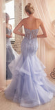 Indulge in elegance with the Ladivine CD332 Long Layered Tulle Tiered Mermaid Gown. This stunning, classic mermaid dress hugs your body and showcases your figure with a fitted, strapless design and a floor-length tiered skirt. The sweetheart neckline and lace-up corset back add a touch of glamour, while the embellished sheer boned bodice and floral beaded details make it a true showstopper. Perfect for any formal event, this dress is sure to turn heads and make you the vision of beauty. An ideal full-length dress for red carpet events, pageant, prom or in any other formal occasions!