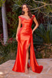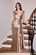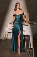 Crafted to captivate, this fitted gown by Ladivine CD393 features a romantic off-the-shoulder neckline with softly ruched detailing that flatters the bust and shoulders. The stretch satin fabrication glides effortlessly over the body, accentuating the silhouette with a draped waist and thigh-high slit for added movement and allure. A lace-up corset back ensures a cinched waist and customizable fit, making this gown a timeless choice for black tie events, wedding guests, or formal occasions.