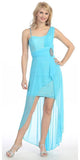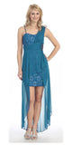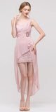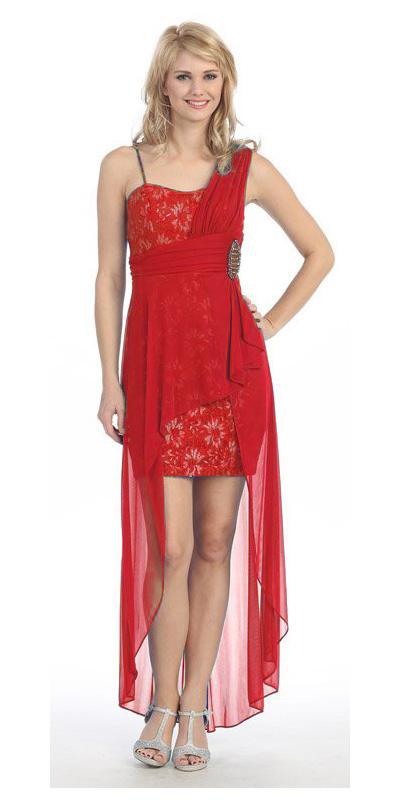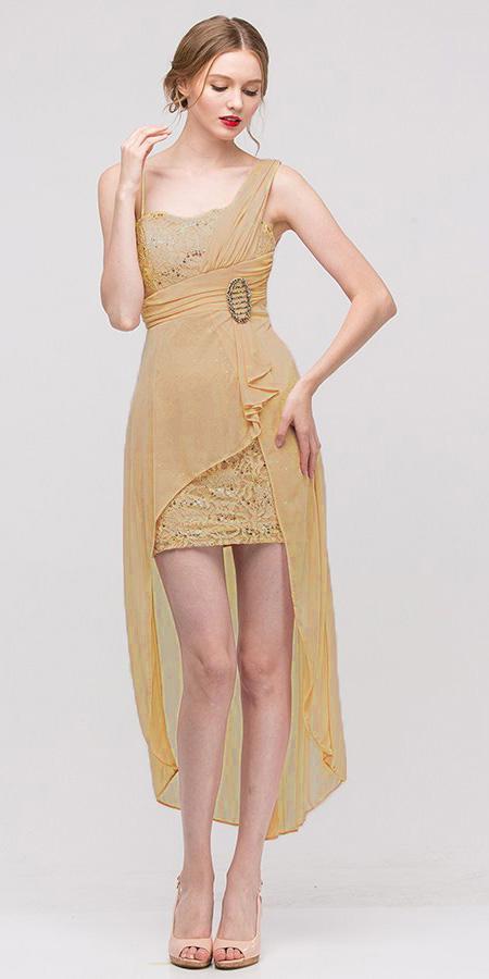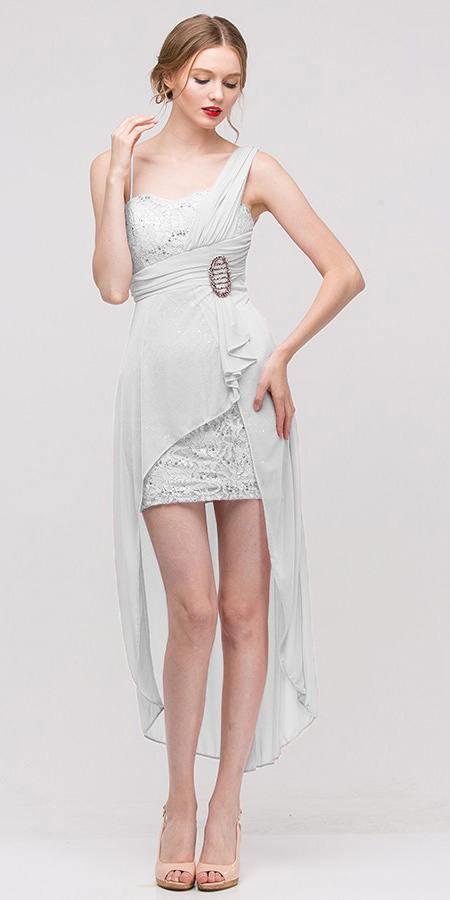 Give yourself an interesting makeover by looking gorgeous in this stunning sheath dress for a cool bridal party. This sleeveless dress in ivory comes designed with spaghetti straps, one of which is beautifully highlighted with a pleated drape that extends to form a broad belt at the empire waistline and cascades down to present a layered high low skirt. A sweetheart neckline beautifully shapes the torso that comes enhanced with textured panels and a rhinestone studded brooch at the waist peps up the overall look.