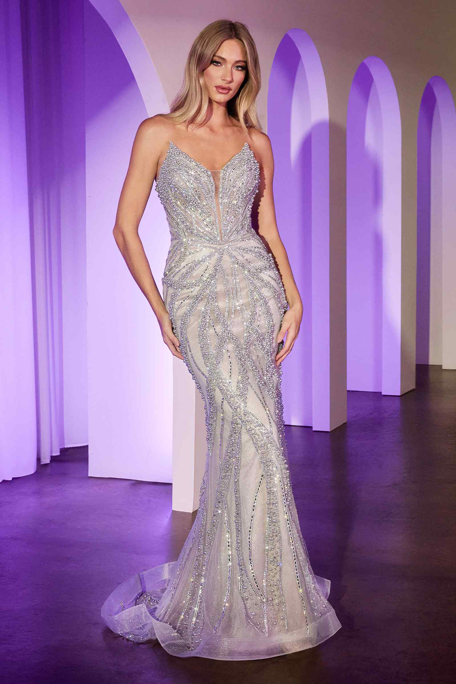 This fitted strapless gown by Ladivine CC0688 features a plunging neckline and an embellished contouring motif that beautifully enhances your silhouette. Crafted from crystal and pearl-embellished tulle overlay, the structured bodice offers both support and style. Ideal for prom, formal events, and red-carpet premieres, this gown is designed to make a glamorous statement.