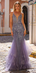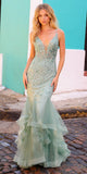 Introducing the Nox Anabel G1368, a formal mermaid dress that showcases elegance with a stunning layered tulle ruffled skirt and embroidered applique. The fitted silhouette hugs the body and features a corset boned bodice for a flattering look. The deep plunging illusion V-neckline, thin spaghetti straps, and open lace-up tie back make this dress an eye-catching, head-turning showstopper. An ideal full-length trumpet dress for black tie, red carpet, prom or in any other formal occasions!