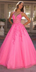 Achieve a dreamy, princess-like look with this magical and timeless A-line ball gown by Nox Anabel H1357. The glitter tulle fabric will make you shine and dance the night away in this formal floor-length dress. The deep plunging illusion V-neckline and embroidered floral lace applique add a refreshing touch, while the corset lace-up tie cutout back completes the poofy and sleeveless design.  An ideal full-length dress for quinceanera, sweet 16, prom or in any other formal occasions!