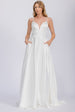 This elegant A-line bridal gown by Eureka EK190 features luxurious bridal satin with a smooth dolce satin finish. Designed with a flattering V-neckline and delicate spaghetti straps, it offers both style and comfort. The gown includes practical pockets and a secure fit with a zipper and corset back, ensuring a perfect silhouette for your special day. Ideal for brides seeking timeless sophistication combined with modern functionality.