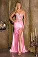Turn heads in this sultry fitted gown by Ladivine C171, crafted with a sheer corset bodice and intricate beadwork that defines every curve. The plunging neckline and delicate spaghetti straps create a captivating silhouette, while the ruched satin skirt flows into a soft sweep train with a daring leg slit. Perfect for prom nights, pageants, or formal events, this gown embodies confidence and allure with every step.