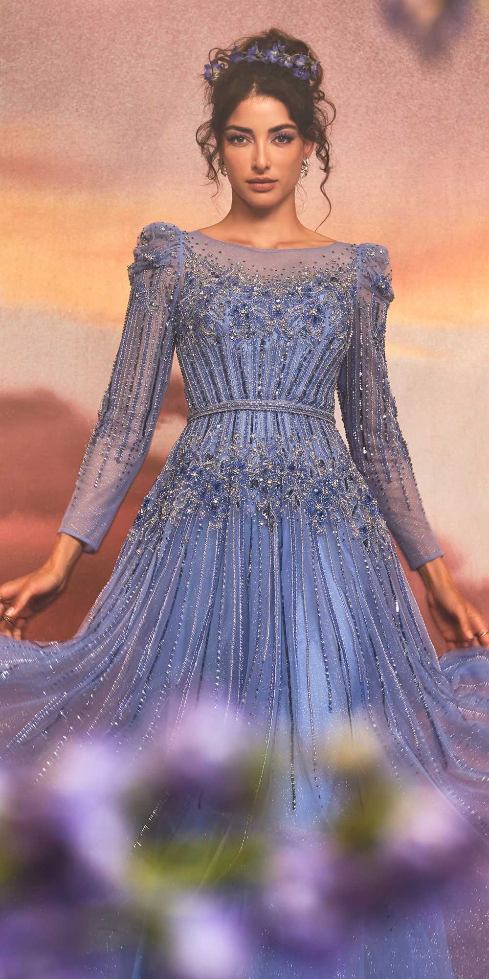 Imagine yourself wearing this beautiful floor length dress by Andrea & Leo A1167. Step into a fairy tale with the exquisite azurite embellished gown. This gorgeous gown features intricate beading and delicate embellishments that give it a whimsical, romantic touch. The stunning layered glitter tulle creates an ethereal effect that will make you feel like a real-life queen. Its belted waistline adds structure to this magical dress, perfect for any dreamy or enchanted occasion. Bring your fairy tale to life in this long sleeve beauty! This formal dress is definitely a one-of-a-kind long dress for red carpet events, pageant, prom or in any other formal occasions!