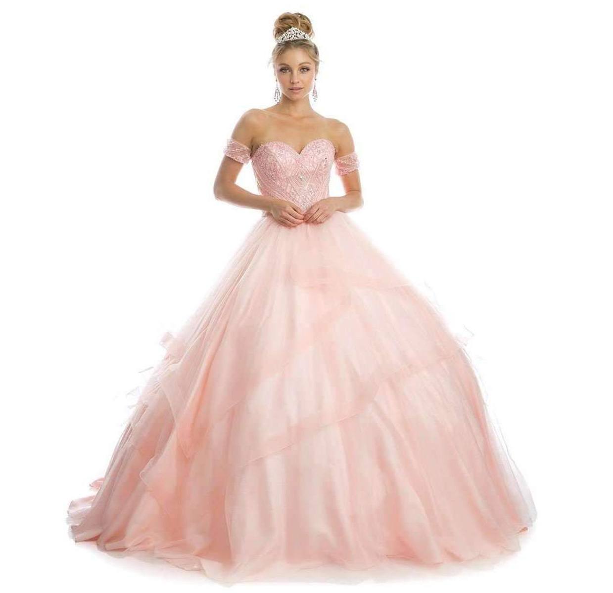 Juliet 1424 Blush Quinceanera Ball Gown Tulle Skirt With Arm Bands Beaded Bodice