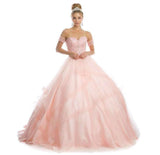 Imagine yourself in this magical poofy quinceanera A-line ballgown in blush by Juliet 1424, which features a strapless sweetheart neckline, an intricate beaded bodice, an asymmetrical tiered layered tulle skirt and comes with detachable armbands and a bolero jacket. A beautiful poofy ruffle layered floor length A-line dress for homecoming, a quinceanera, prom or any special occasion!