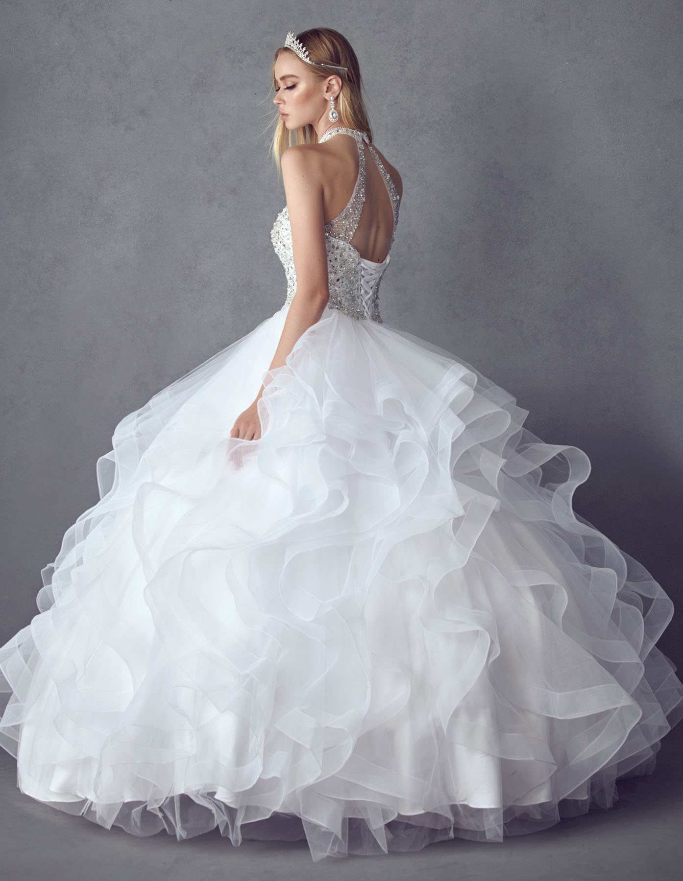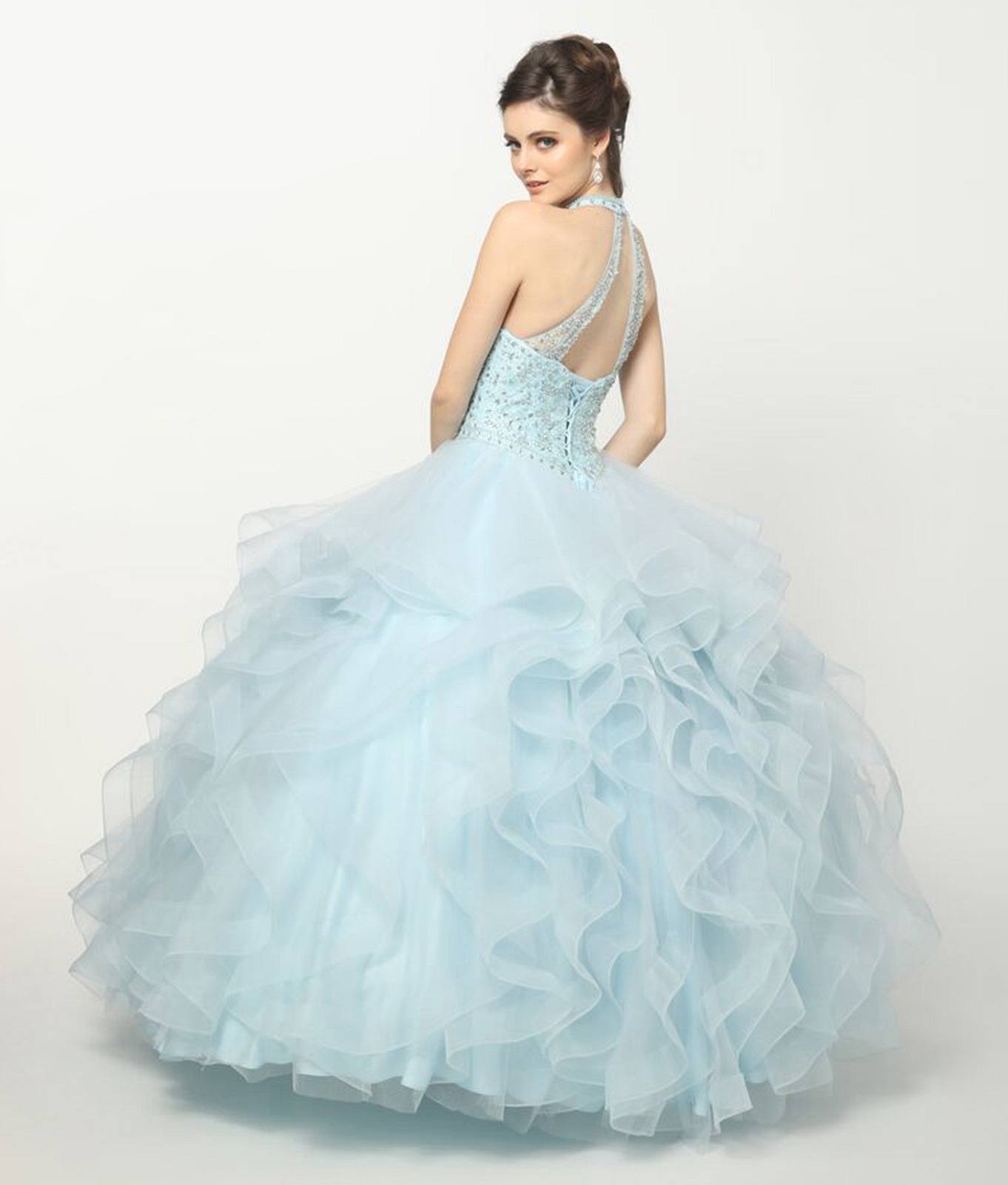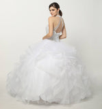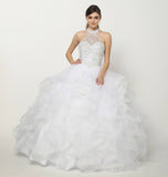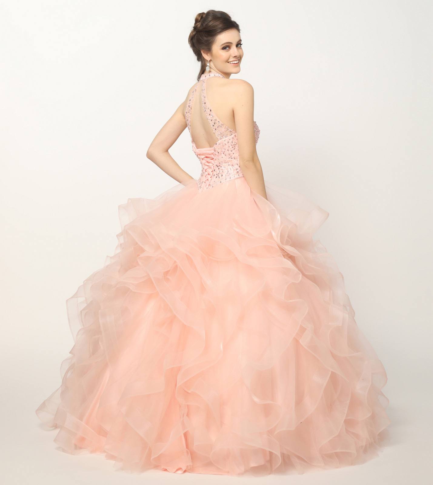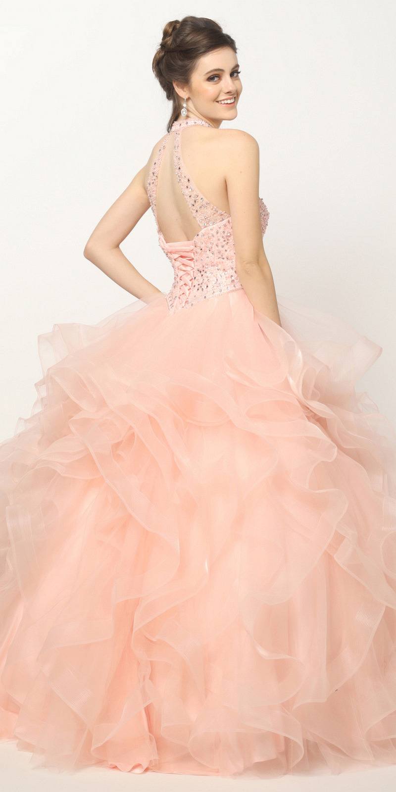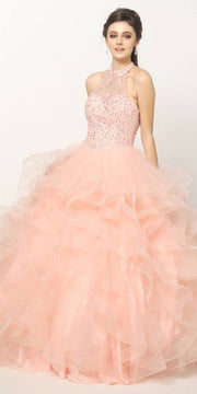 You will dazzle the evening in this magical poofy Cinderella A-line ballgown in blush by Juliet 1420, which features a halter top, beaded bodice and a corset lace up tie back. A beautiful poofy ruffled floor length A-line dress for homecoming, a quinceanera, prom or any special occasion!