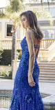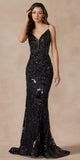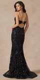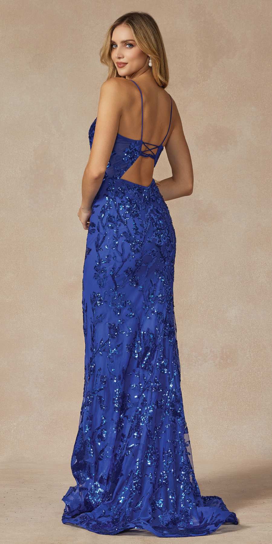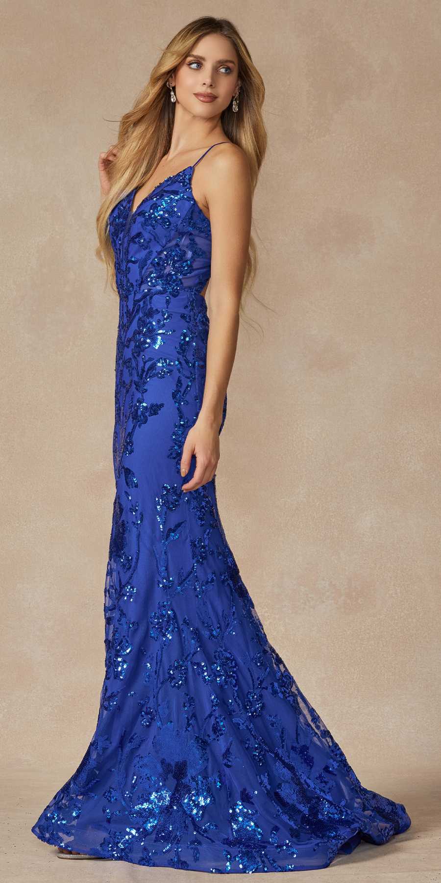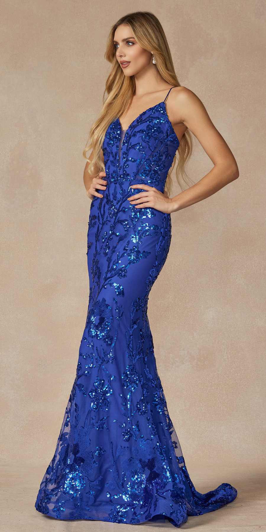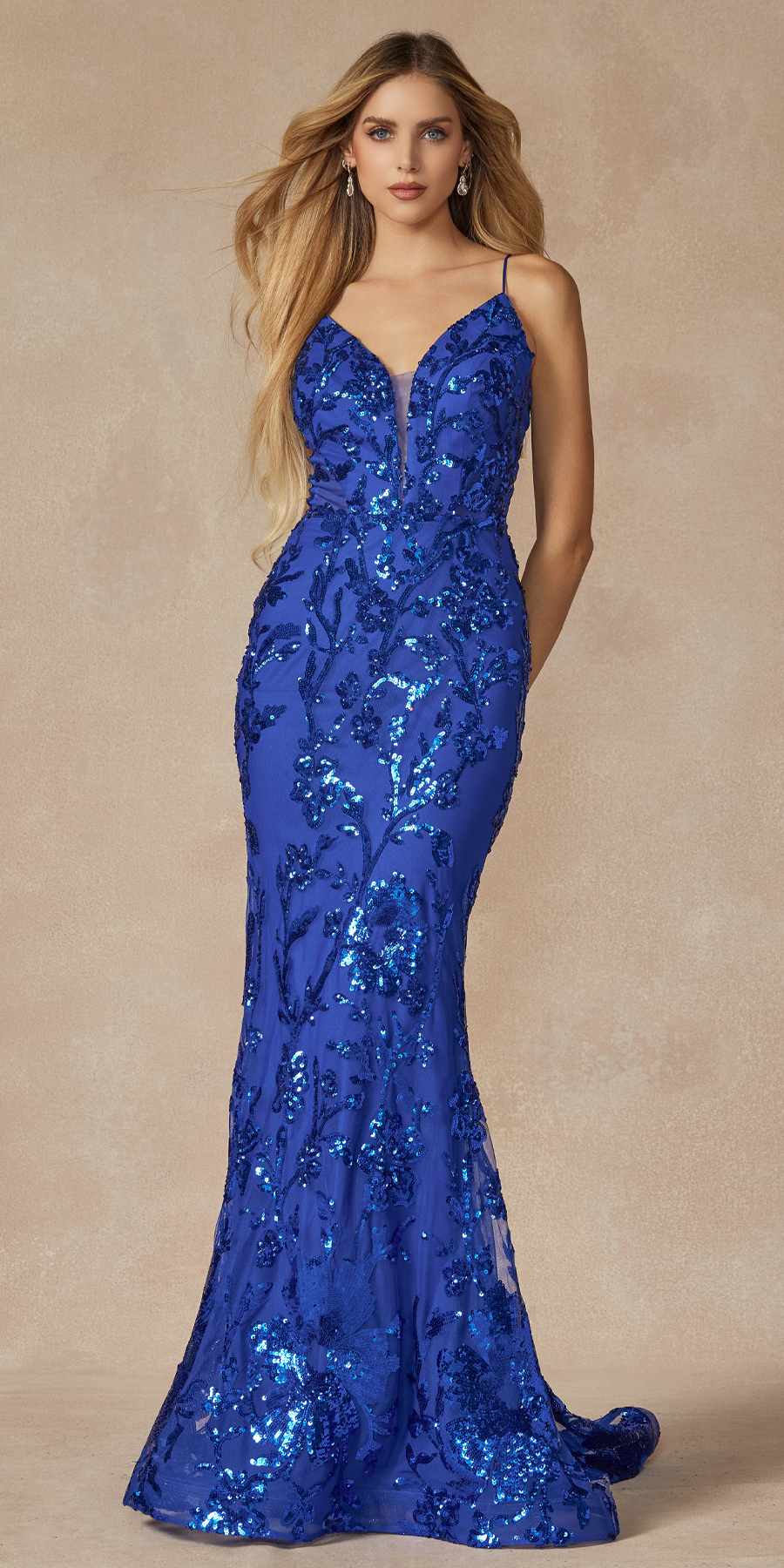 Dazzle the evening in this beautiful floor length fitted dress by Juliet 2411. This long sleeveless fitted sequin gown has a plunging sheer panel insert V-neckline with spaghetti straps and features an open cut out corset tie back. A beautiful dress for formalsgala party, prom or any special occasion!