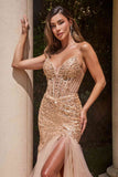 Make a show-stopping entrance in this exquisite Ladivine floor-length number! It'll be sure to mesmerize with its eye-catching sequin bodice, leg slit, V-neckline and trumpet skirt that sparkles and shines - the perfect combo of sexy and luxurious. Plus, it's got corset boning for a truly fitted, showstopping look, not to mention a glamorous, tulle-flared and beaded pointed bust that'll turn heads with its breathtaking beauty. Sweep 'em off their feet with a single glance - CD0214's got it all!