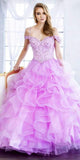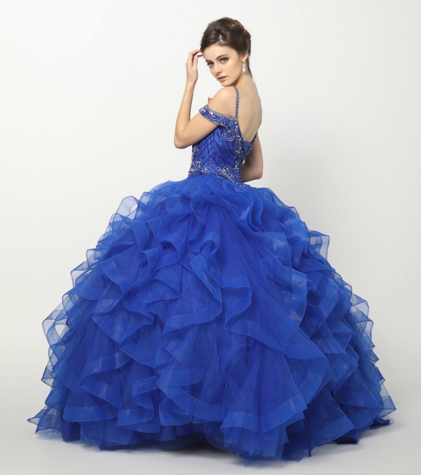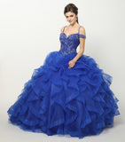 You will dazzle the evening in this magical poofy Cinderella A-line ballgown by Juliet 1421, which features a cold shoulder strap, an intricate beaded bodice and a corset lace up tie back. A beautiful poofy ruffle layered floor length A-line dress for homecoming, a quinceanera, prom or any special occasion!
