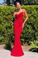 This full-length dress by Astee T2008 features delicate spaghetti straps and a sleeveless, fitted silhouette that flatters your figure. The open back is accentuated with intricate lace detailing, complemented by a graceful cowl neckline that extends into a matching cowl-like back design. Perfectly suited for any occasion, this elegant dress combines sophistication and modern style for a polished, standout look.
