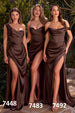 This fitted gown by Ladivine 7448 showcases a one-shoulder pleated neckline with a gathered waistline and a leg slit, offering a touch of modern elegance. Made from luxe satin, the structured boned bodice provides a flattering fit, while the center back zipper ensures a sleek finish. Perfect for bridesmaids, wedding guests, or formal events, this dress is a sophisticated choice for any special occasion.