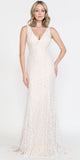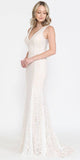 Imagine yourself wearing this beautiful floor length stretch lace dress by Poly USA | Ed Young 8496. This long sleeveless fitted column dress features a V-neckline and closed illusion back. A sophisticated and classic attire for wedding events, awards ceremony or any other formal occasions.