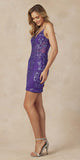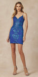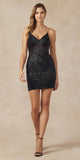 Dazzle the evening in this beautiful short, fitted dress by Juliet 874, which features a boned bodice embellished with glitter and sequins. This dress has a small V-neckline and an open V-back.