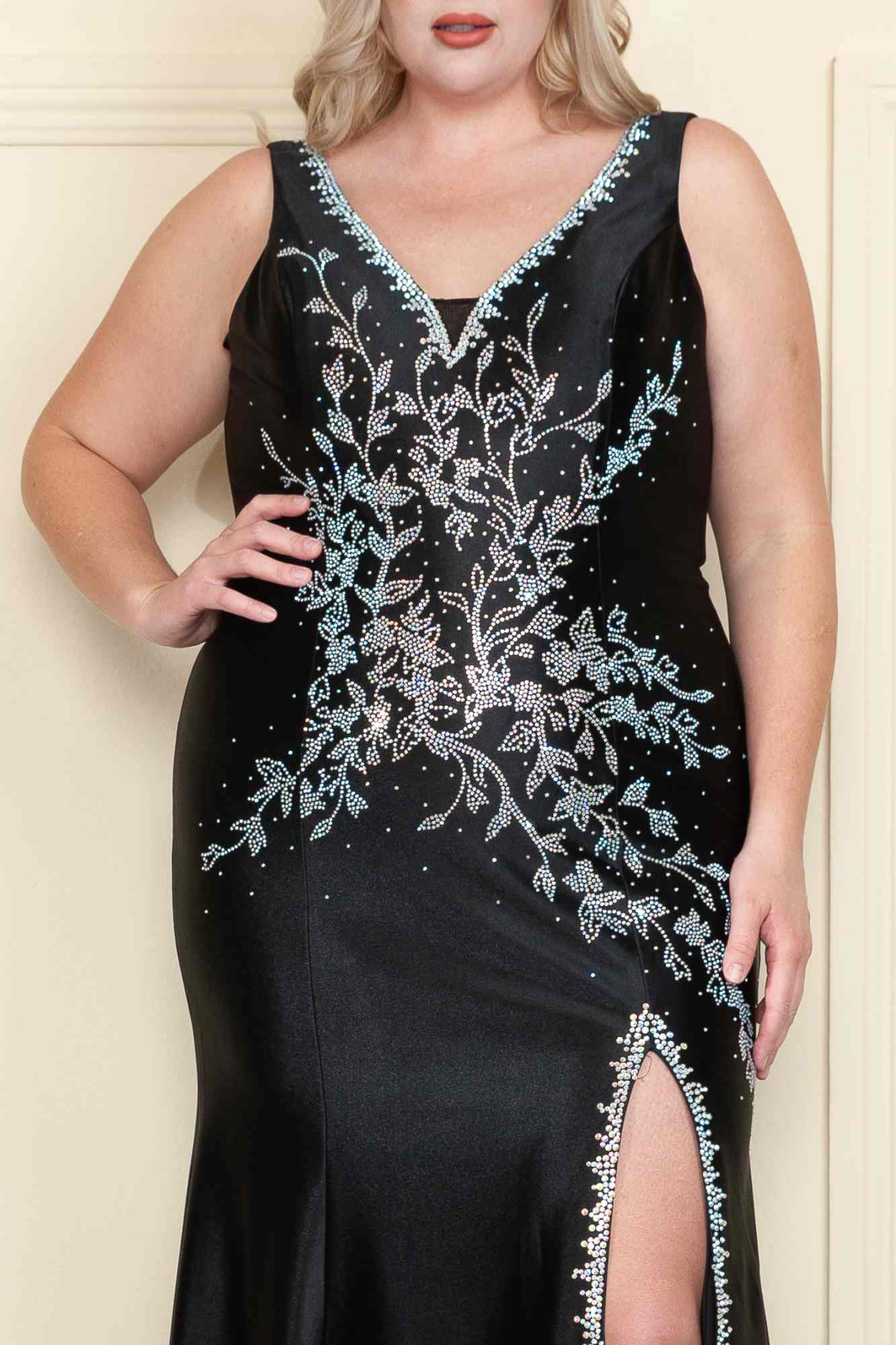 Imagine yourself wearing this beautiful floor length fitted plus size dress by Lindas W1132. Slip into this knockout jersey dress; its V-neckline sparkles with shimmering rhinestones and sheer illusion. And don't stop there, you'll glow with the fitted silhouette, corset tie-up back and sexy front leg slit. Get ready to wow 'em in this gorgeous, long and sleeveless number with a sweep train (oh la la!). An ideal full-length dress for prom, special occasion, party or in any other formal occasions!
