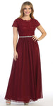 This A-line silhouette long formal dress by Celavie 6469 features a lace bodice with scallop neckline. A shimmering thin band add some sparkles and emphasize the natural waist that crowns the softly swaying chiffon skirt. This lovely gown is fully lined with comfy fabric, an ideal outfit for mothers of bride or groom or in any other special occasions!