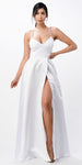 CLEARANCE! - Imagine yourself in this satin A-line dress by La Scala 25895, which features spaghetti straps that overlap to an open criss-cross back and front leg slit. This sleeveless party dress is great to wear on any special occasions. Available in white, XL only.