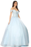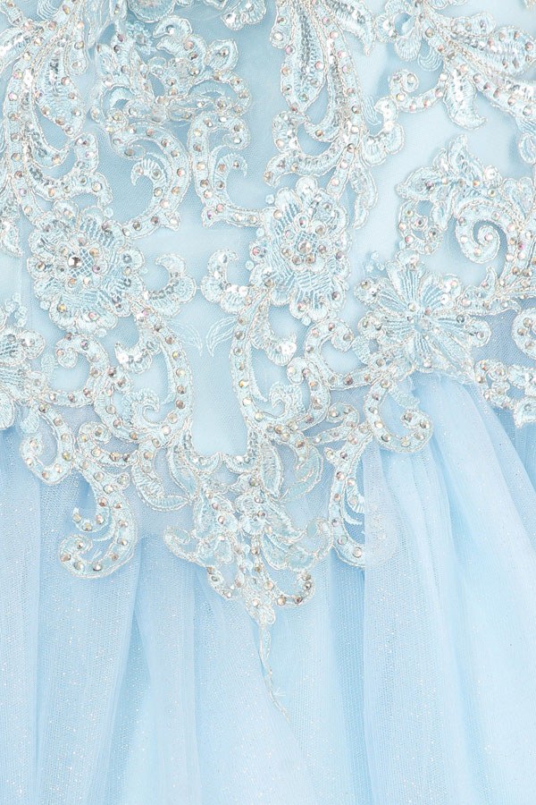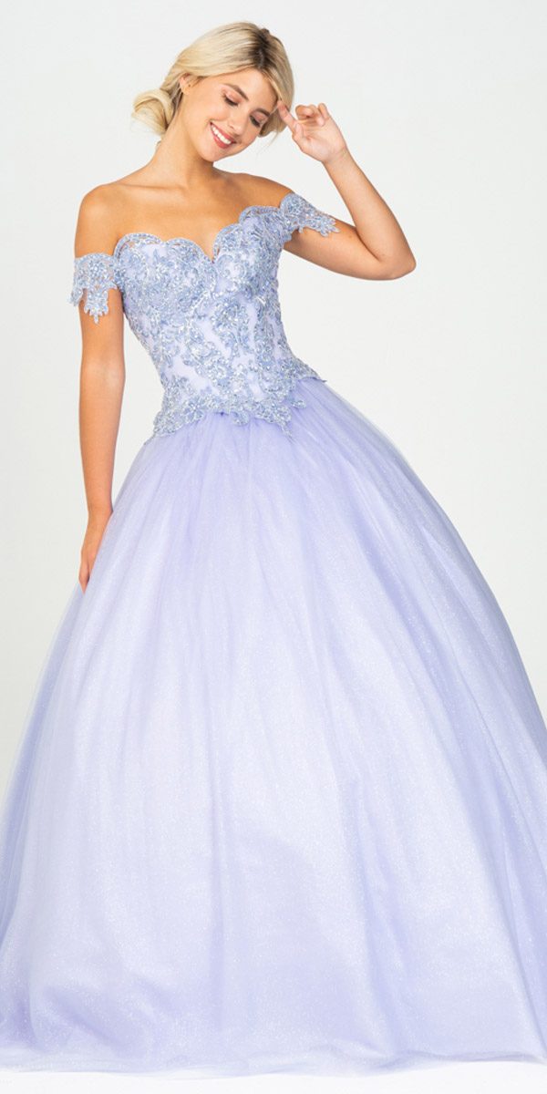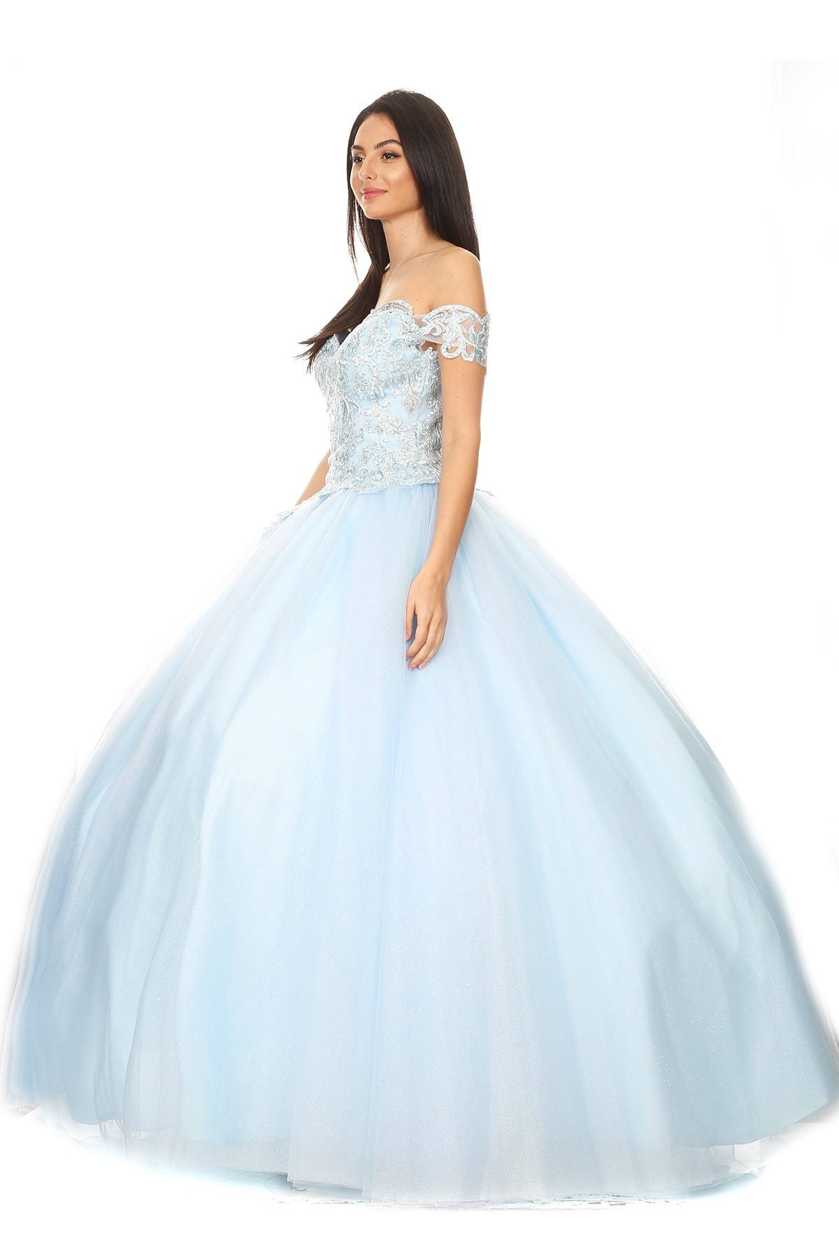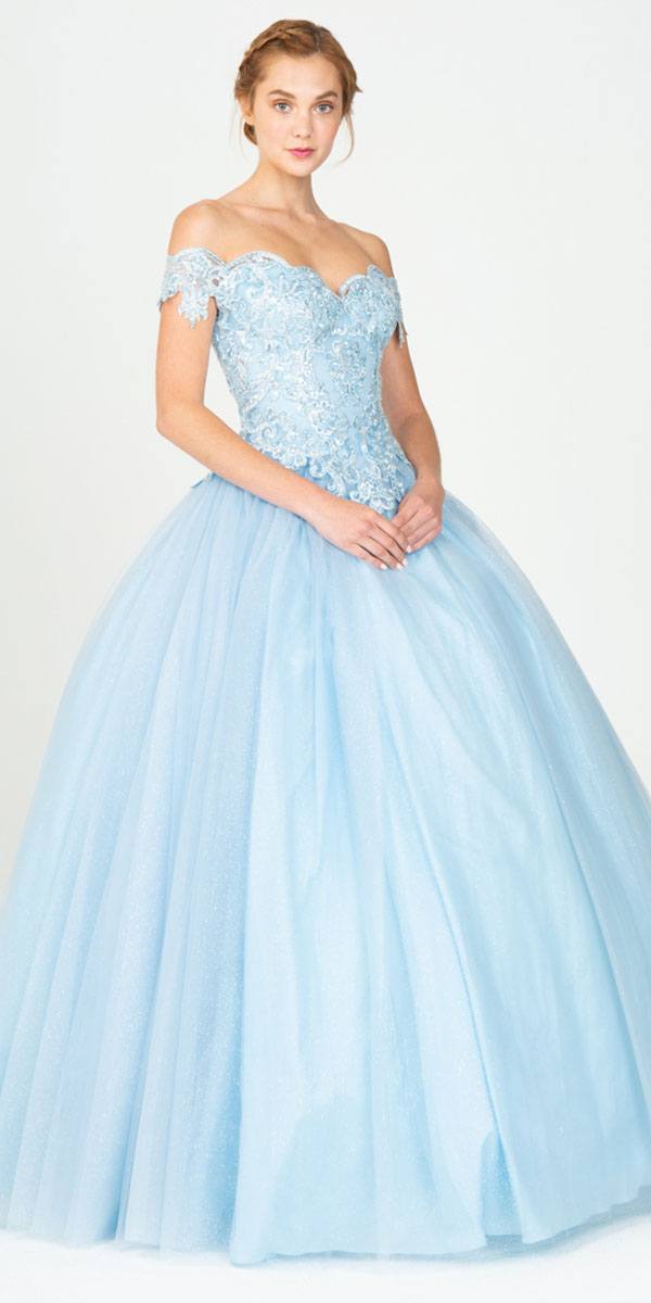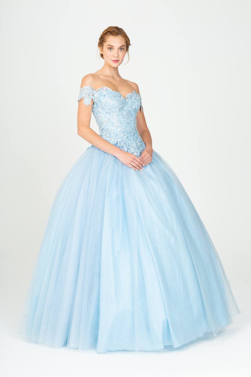 Shine and stand out in this stunning quinceanera gown by Eureka Fashion 9300. Made of mesh and lace this ball gown features an applique embellished bodice topped with tiny dazzling beads, a corset lace-up back and the trendy off-the-shoulder style. A perfect attire for prom, red carpet events, quinceanera events or any other special celebrations.