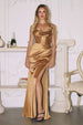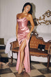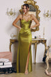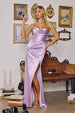 Elevate your evening look with this sultry stretch satin gown by Amoris T815, designed with a draped bustier-style bodice and flattering ruched hip detail. Thin straps and a soft sweetheart neckline frame the décolletage, while the corset-inspired lace-up back allows for a customizable fit. The thigh-high slit adds a bold finishing touch, perfect for prom, formal events, or red carpet-worthy moments.
