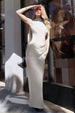 The high halter neckline creates a refined, contemporary silhouette, while gentle draping through the skirt enhances the figure without overpowering the design. Floor-length and effortlessly polished, this gown is perfect for weddings, elopements, courthouse ceremonies, rehearsal dinners, and bridal celebrations.