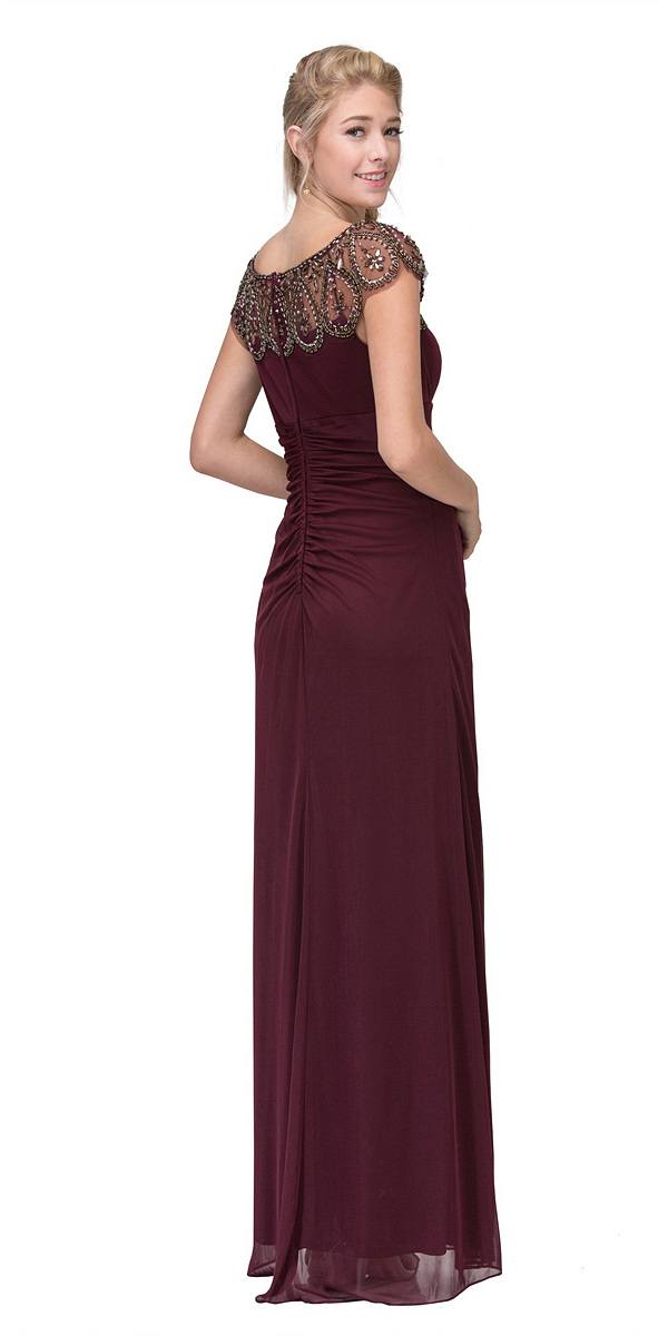 Elegant faux-wrap column silhouette formal dress in burgundy by Eureka Fashion 3927. An elegant dress with beaded mesh wrapped around the shoulders resulting to a cap sleeved with beaded neckline style. Made of delicate chiffon fabric this ruched back floor length dress is an excellent outfit for awards night, marine ball, wedding events or any other formal occasions.
