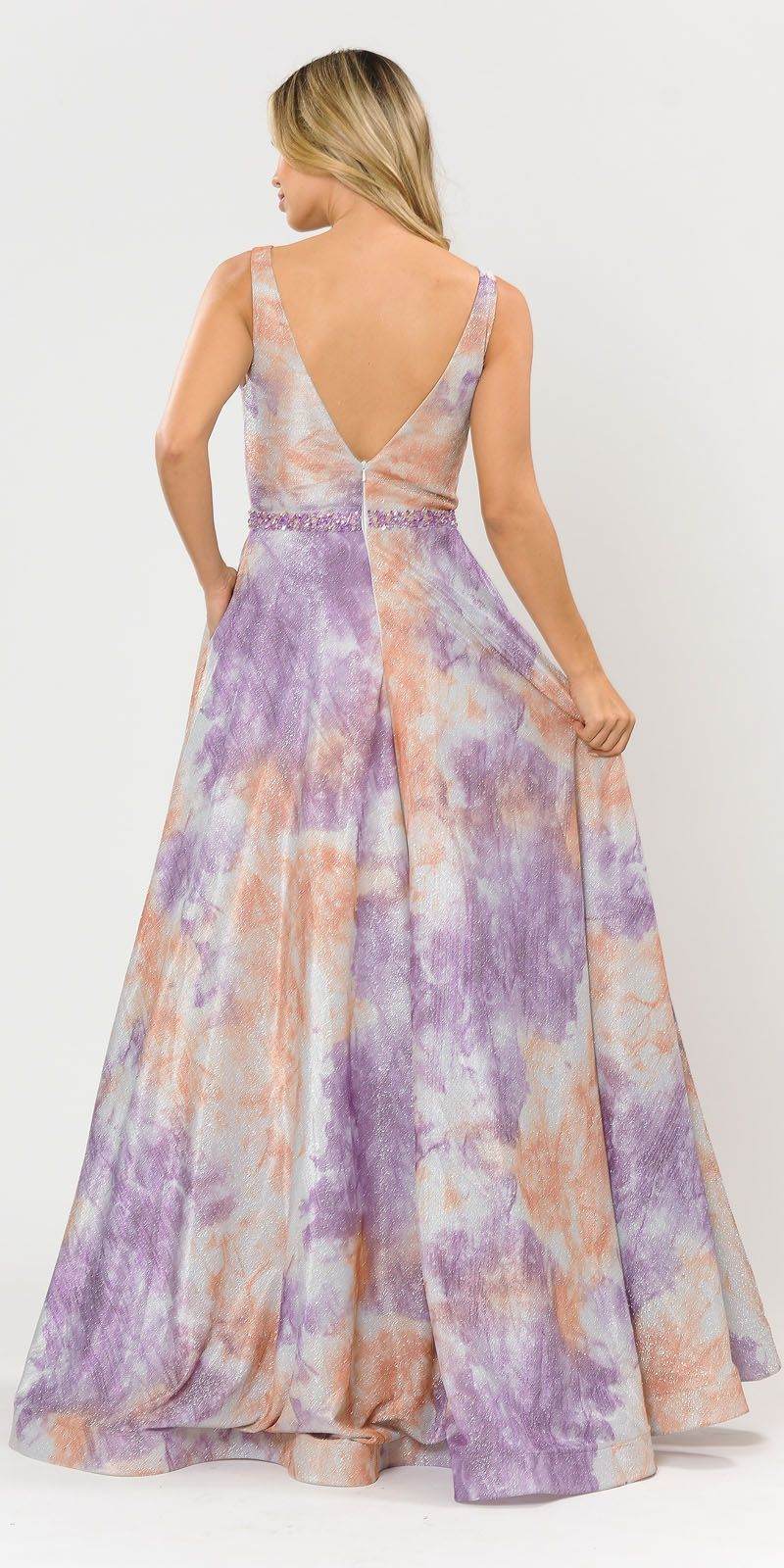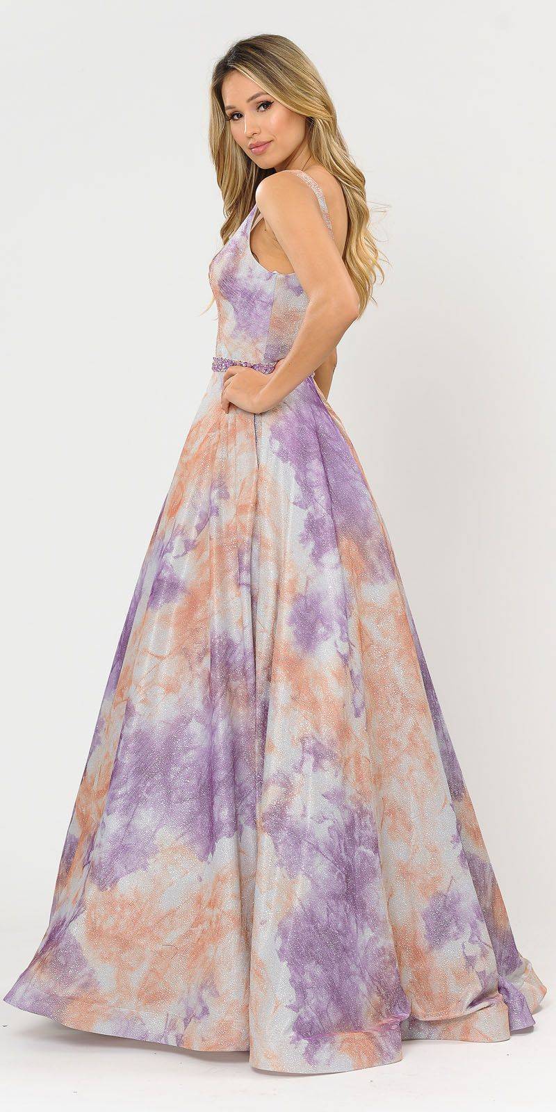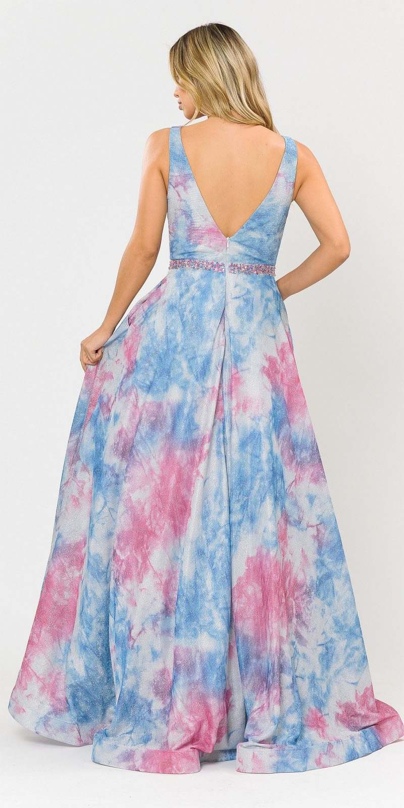 Dress up for your next special occasion in this exquisite multi-color style ball gown made of glitter knit by Poly USA | Ed Young 8346 in blue/pink. A thin beaded band decorates and emphasize the natural waist contributes a fashionable look. Featuring a deep v-neck with sheer-inset matched the deep v-back with zipper closure. A side pockets provides convenience on this fabulous full-length formal dress, a perfect outfit for red carpet events, pageant, prom or in any other formal occasions!