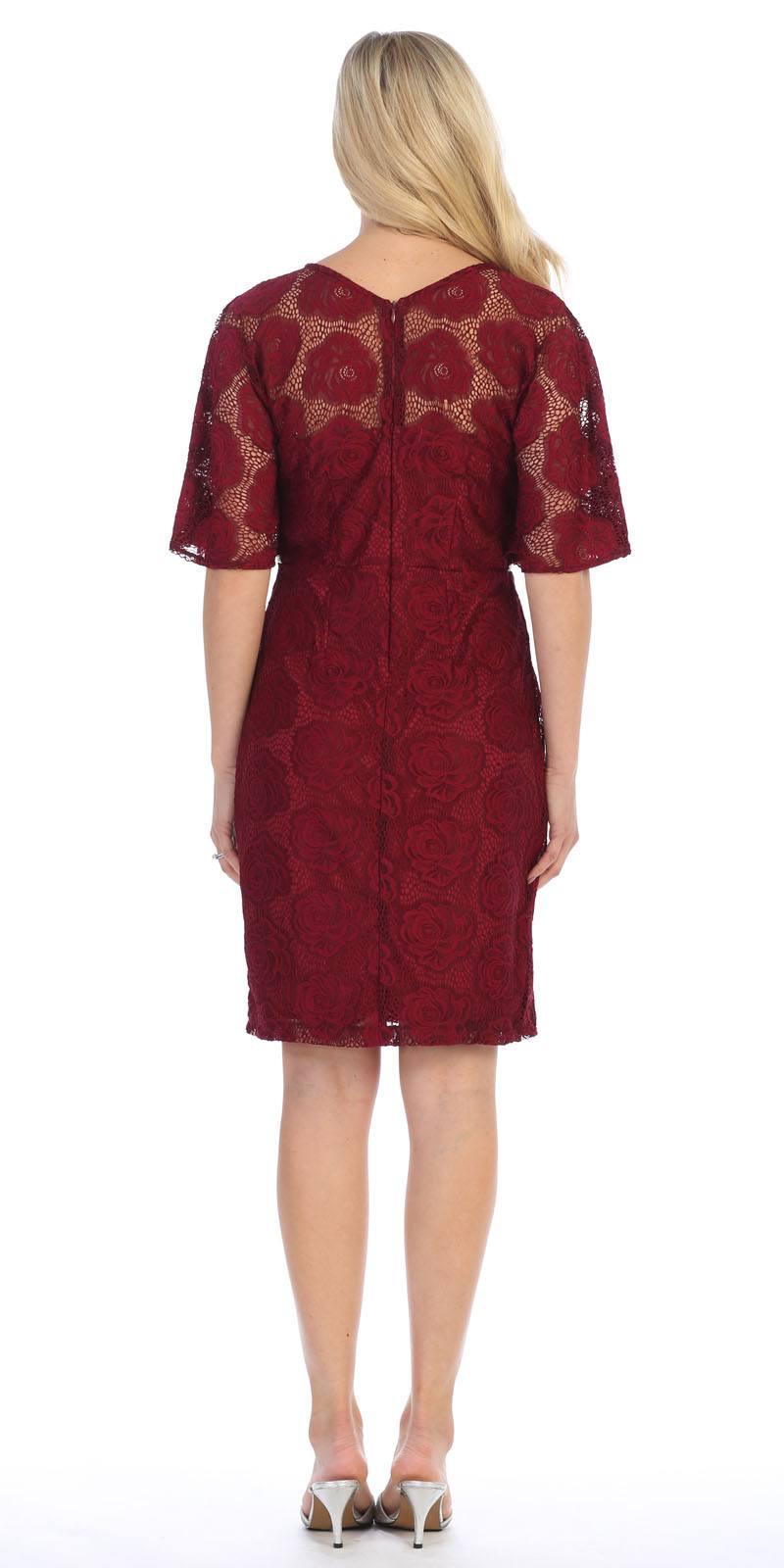 Slip into this lovely short lace dress by Celavie 6337 in burgundy. A gorgeous sheath silhouette knee-length dress with a little sparkle of glimmering thin waistband and flutter sleeves with round neckline. This made of lace dress is a delightful outfit for wedding events, cocktail party, graduation rites or any other semi-formal events.