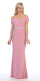 Step into this elegant off shoulder formal evening gown. Made with jersey, this full length sheath column dress has a short sleeves with a semi-sweetheart neckline and features an applique embellished waist. Click here for the knee length version Celavie 6292 of this dress.