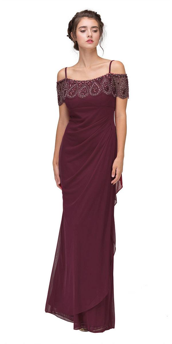 Cold-Shoulder Beaded Long Formal Dress Burgundy
