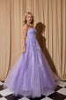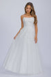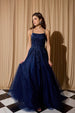 Radiate elegance in this enchanting floor-length gown by Eureka EK197. The A-line silhouette flatters every figure, while delicate spaghetti straps frame the shoulders with understated grace. The bodice showcases intricate floral lace embroidery adorned with sequins, supported by internal boning for a sculpted fit. Shimmering mesh with glitter detailing adds dimension and sparkle throughout, and the corset back provides both structure and visual interest.