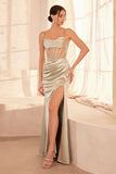 Ladivine Amoris T812 Long Fitted Sheer Bodice Cowl Neck Satin Prom Dress - sienna