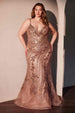 This fit-and-flare plus size gown by Ladivine CC0389C boasts a plunging neckline and delicate thin straps, creating a striking and graceful silhouette. Intricate crystal beading and embellished lace cascade over tulle, accentuating the cinched waistline and structured bodice. With its lace-up corset back, this dress is an exquisite choice for black tie events, galas, or formal occasions like prom.