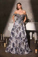 • Design: Off-the-shoulder neckline with crystal-embellished bodice and metallic floral skirt