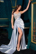 Make a bold statement in this strapless fitted gown by Ladivine CDS544 featuring a dazzling crystal-beaded corset bodice and a satin stretch skirt that hugs every curve. The sweetheart neckline, sleek leg slit, and flowing side sash add drama and elegance. Perfect for red carpet events, pageant, prom, formal galas, or upscale black-tie events.