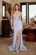 Elevate your formal look with this stunning Nox Anabel C1845 fitted jersey gown. Featuring a deep V sweetheart neckline and boned bodice with elegant off-shoulder sleeves, this full-length dress showcases intricate woven embellishments throughout. The corset lace-up back adds dramatic flair, while a thigh-high slit provides modern sophistication. Crafted from tulle with full lining.