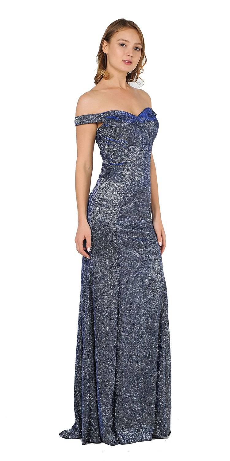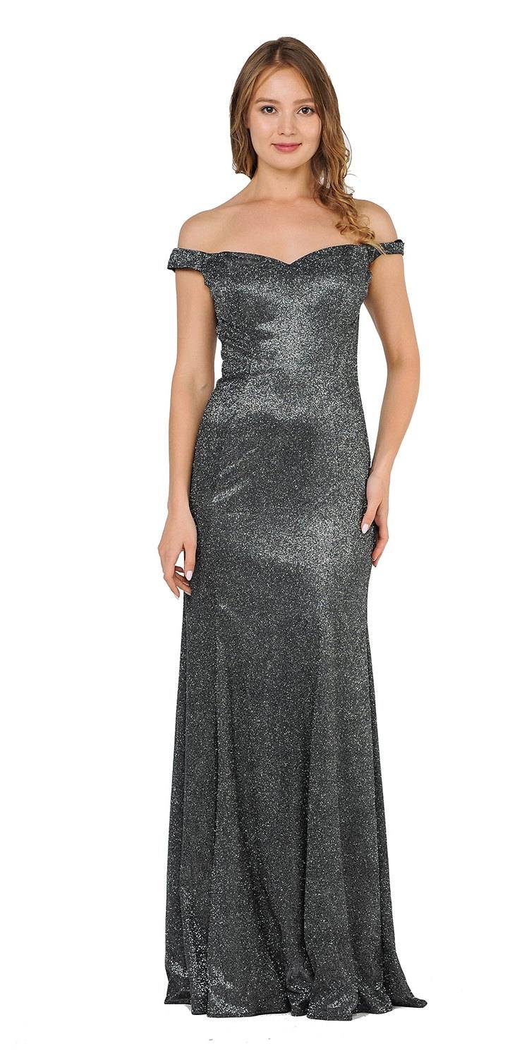 Dress up for your next special occasion with this glittering column silhouette long formal dress by Poly USA | Ed Young 8482. This trendy off-the-shoulder style dress has semi-sweetheart neckline and zipper back closure, an elegant attire for prom, awards night or any other formal occasions.