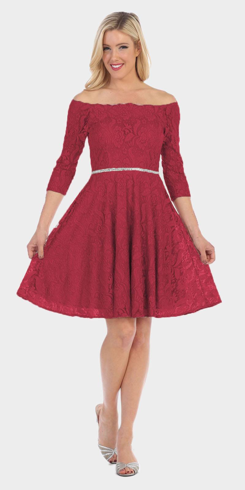 Celavie 6343 Off-the-Shoulder Short Lace Homecoming Dress Burgundy