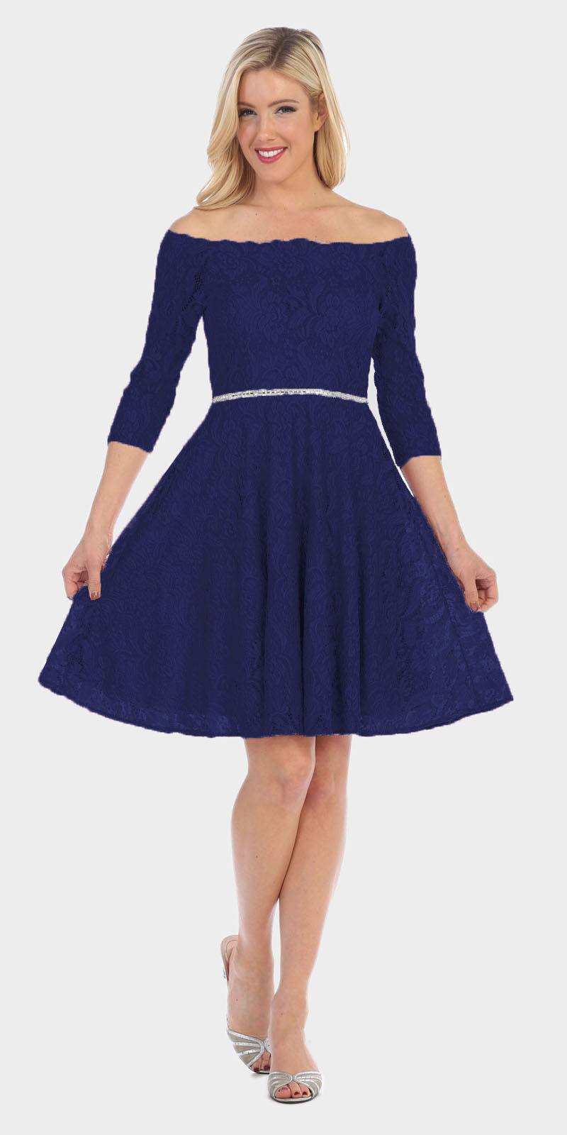 Celavie 6343 Off-the-Shoulder Short Lace Homecoming Dress Royal Blue