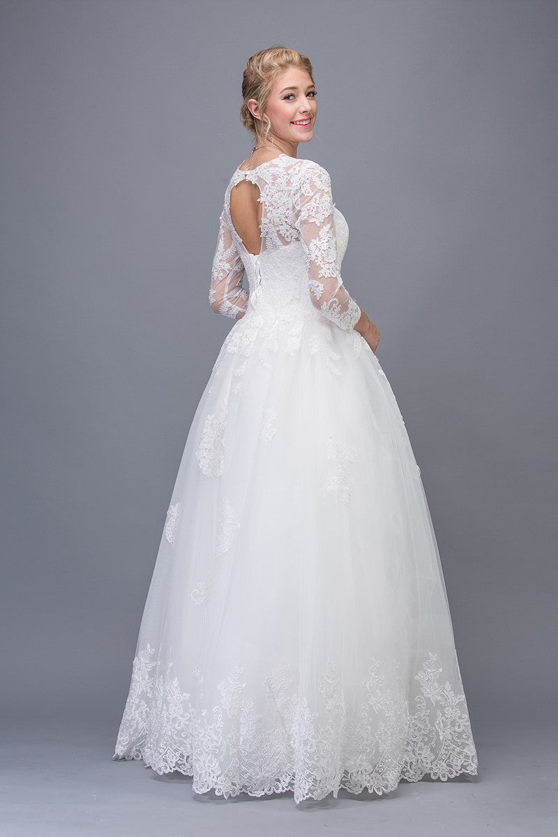 Gorgeous wedding ball gown made of corded lace by Eureka Fashion 6515. This wedding gown has embroidered illusion long sleeved, illusion neckline, cut-out lace up back and the hemline has astonishing embroidery. Enjoy your most memorable day wearing this lovely bridal gown with full of sophistication.