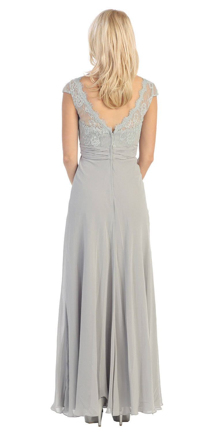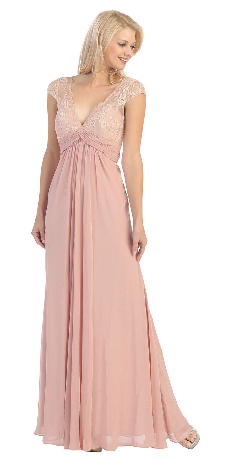 A simple dress flaunts charismatic elegance in an unbeatable manner! Perfect for a lavish cruise dinner, this party dress in dusty-rose exhibits subtle glamour with its brilliant conceptualization. A floral lace panel renders an exquisite appeal to the bodice by styling the yoke and short cap sleeves in a beautiful manner. A plunging V-neckline reaches up to the empire waist etched with ruched panels positioned diagonally. A long A-line skirt with subtle pleats flows up to the floor-length for a charming look.