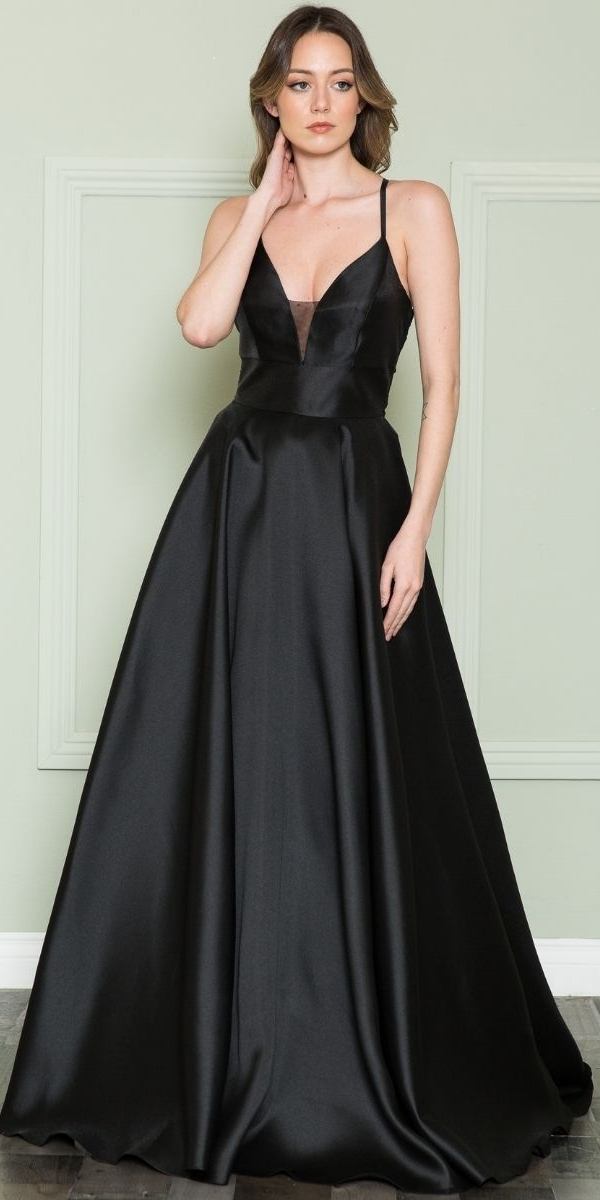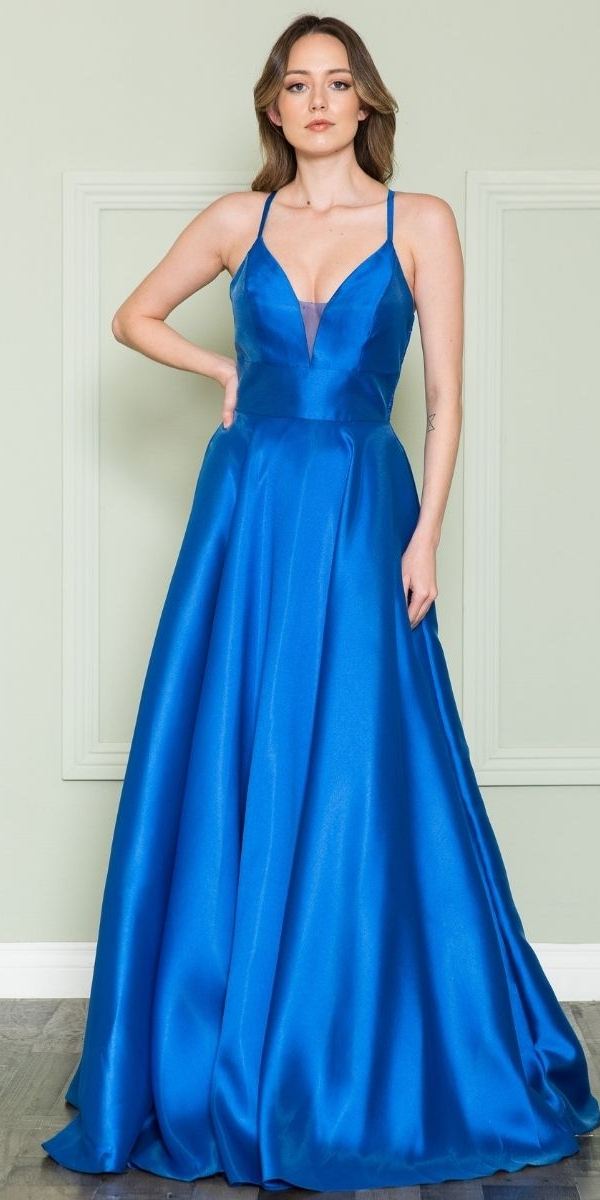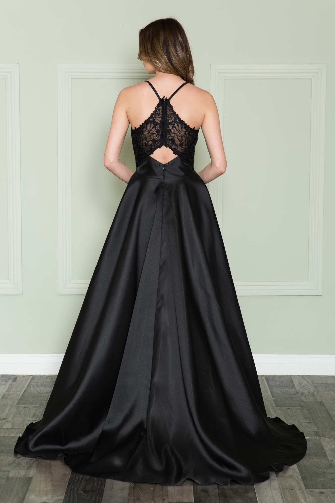 Imagine yourself wearing this beautiful floor length dress by Poly USA | Ed Young 8762. This long V-neckline with sheer insert panel gown features side pockets and a lace back with keyhole cut out. An ideal full-length dress for red carpet events, pageant, prom or in any other formal occasions!