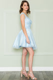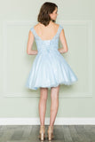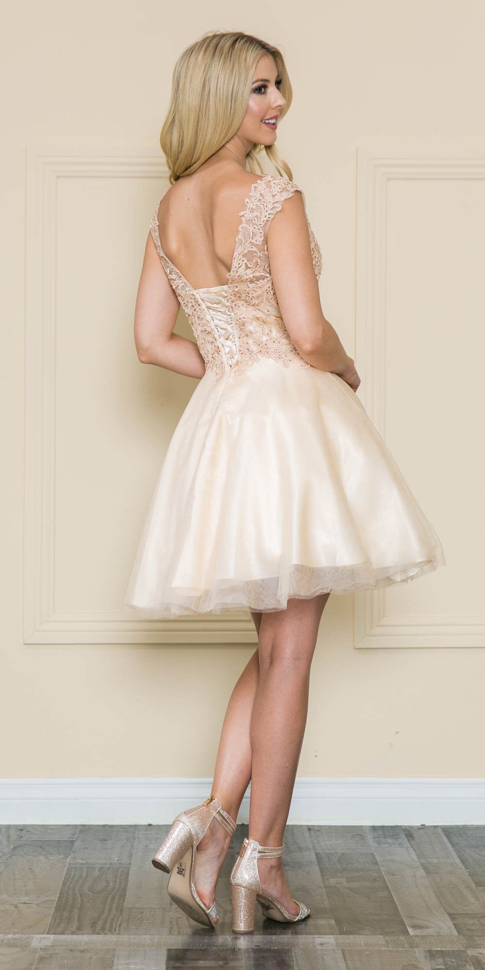 Imagine yourself wearing this beautiful short A-line mesh dress by Poly USA | Ed Young 8902. This short, A-line dress features a V-neckline and lace up tie back. An ideal knee-length dress for bridesmaid, party, cocktail or in any other formal occasions!