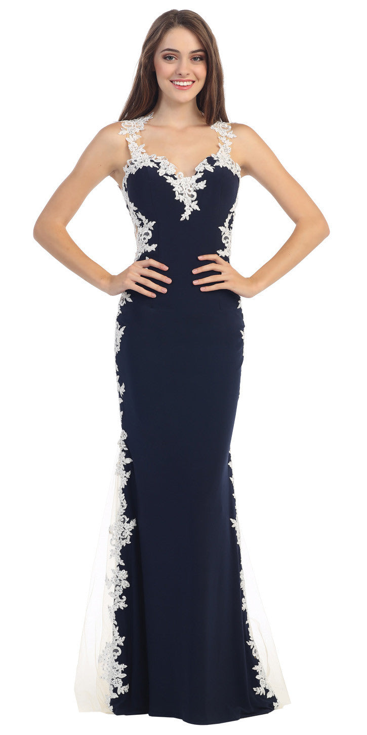 Eureka Fashion 6006 Sheath Mermaid Silhouette Gown Navy Blue White Floor Length Lace Trim